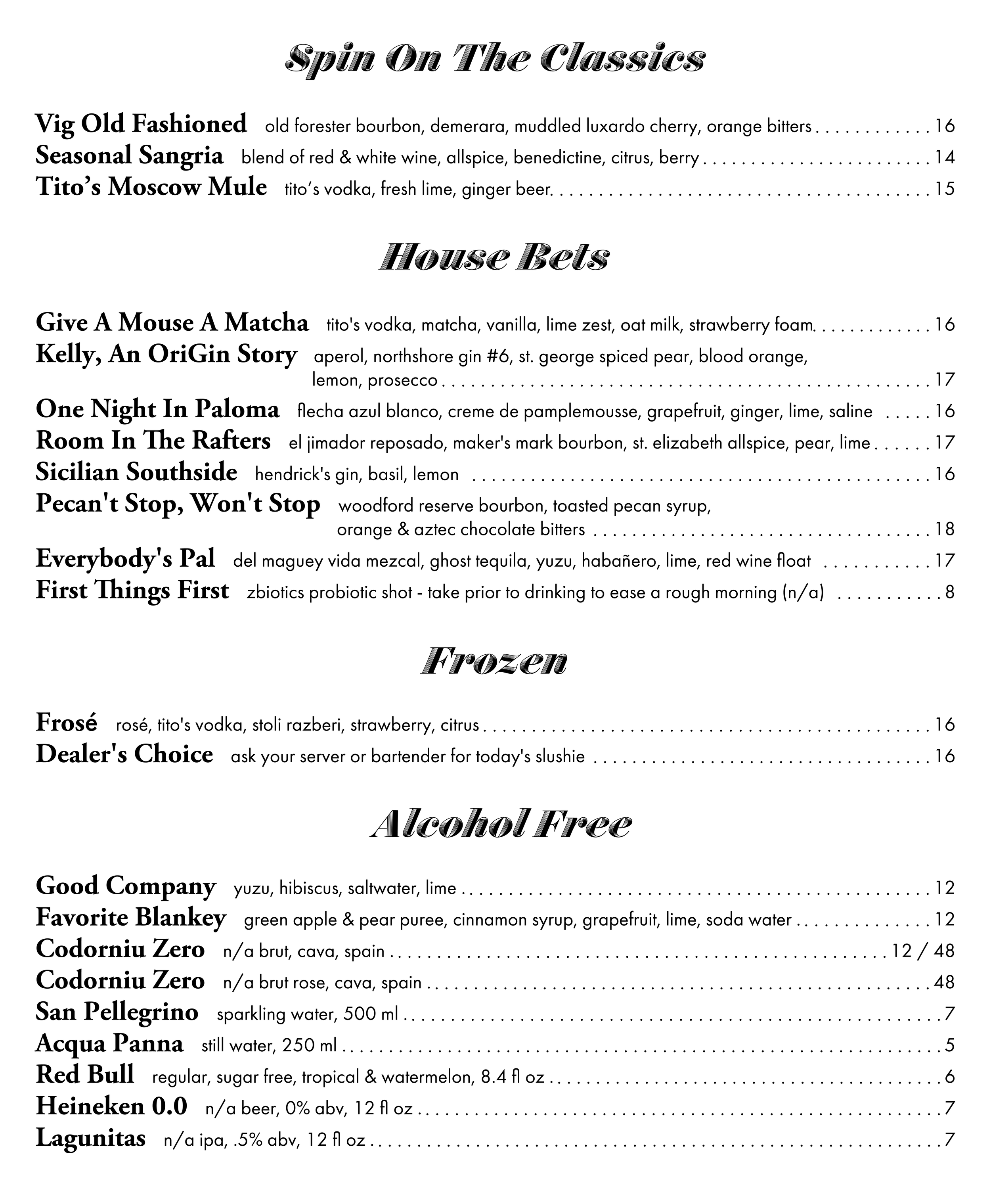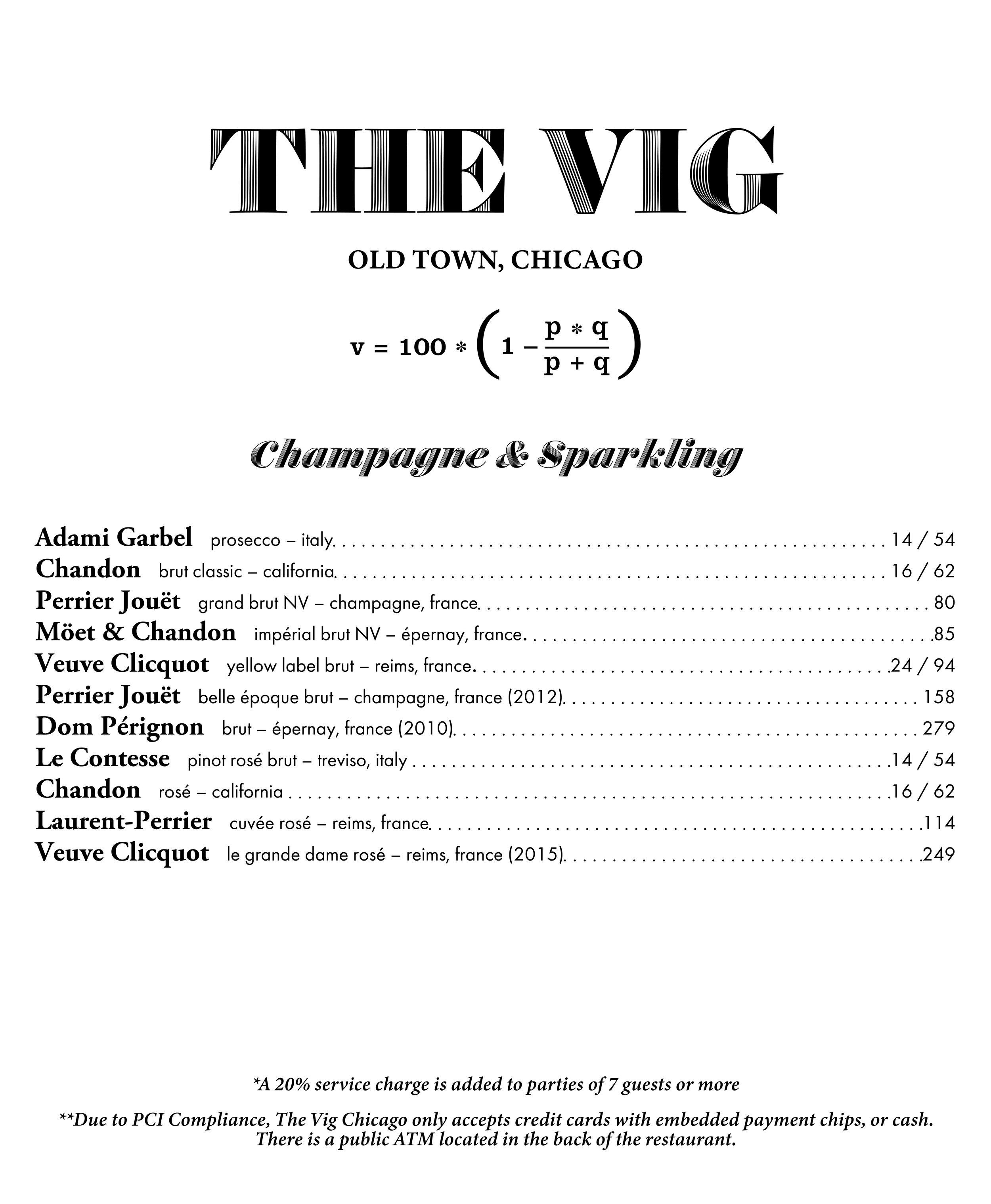 Due to PCI Compliance, The Vig Chicago only accepts credit cards with embedded payment chips, or cash. There is a public ATM located in the back of the restaurant.