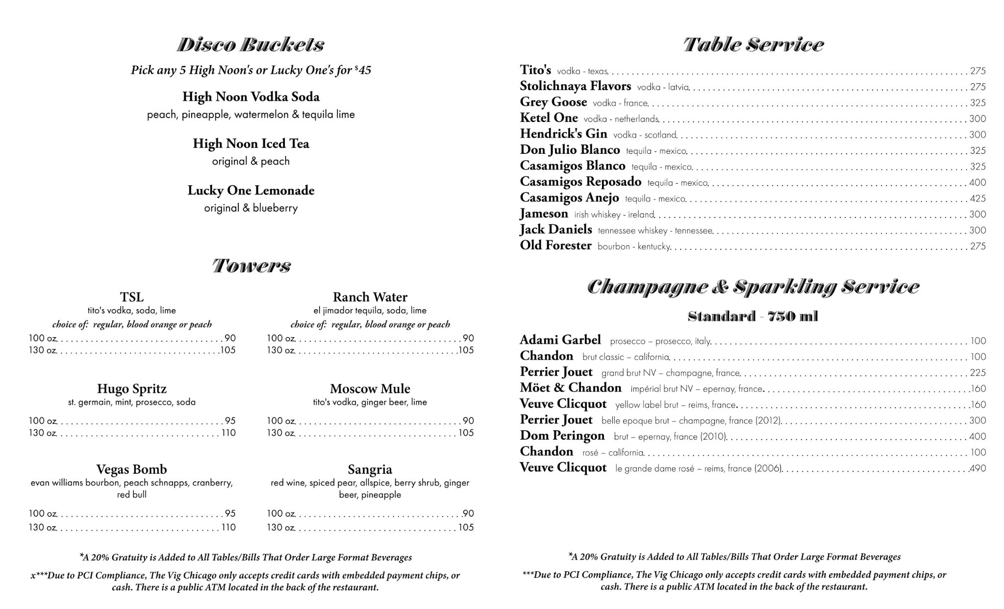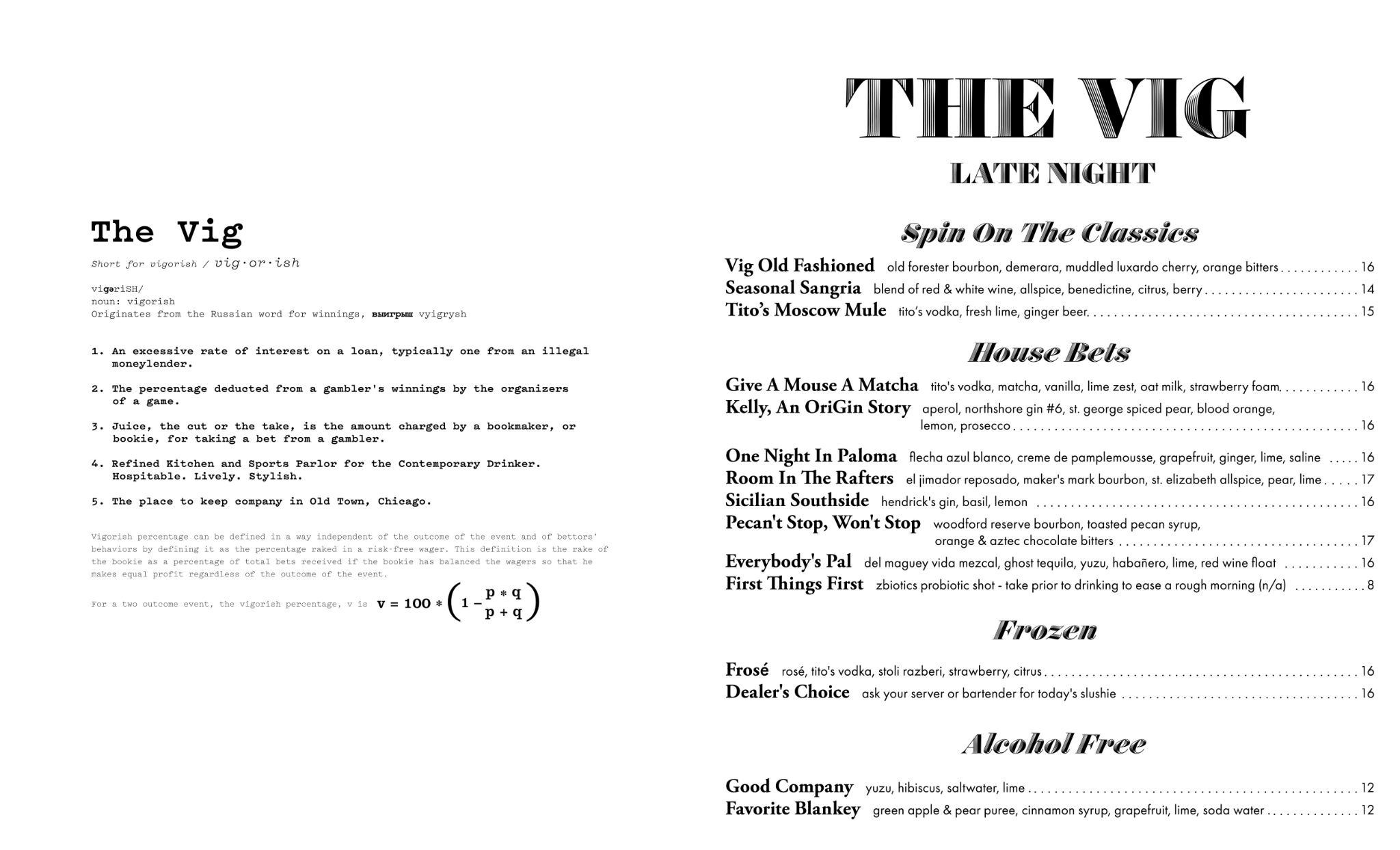 Due to PCI Compliance, The Vig Chicago only accepts credit cards with embedded payment chips, or cash. There is a public ATM located in the back of the restaurant.